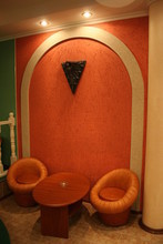 Стены сауны "Славянка" выложены кирпичом и плиткой, пространство украшают величественные колонны, а потолок над бассейном и банкетной зоной стилизован под небосвод. На окнах – портьеры, а бассейн от основного помещения отделяют арки с ажурными вставками.
